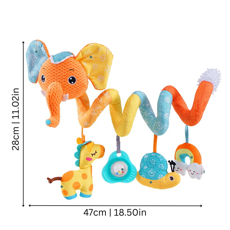 Einfach um Stäbe oder Griffe wickeln – ganz ohne Klett oder Knöpfe. Die weiche Spirale bleibt stabil und sicher. Hängende Tierfreunde, kleine Rasseln und sanfte Klänge stimulieren die Sinne der Babys und fördern ihre motorischen Fähigkeiten – ganz spielerisch.